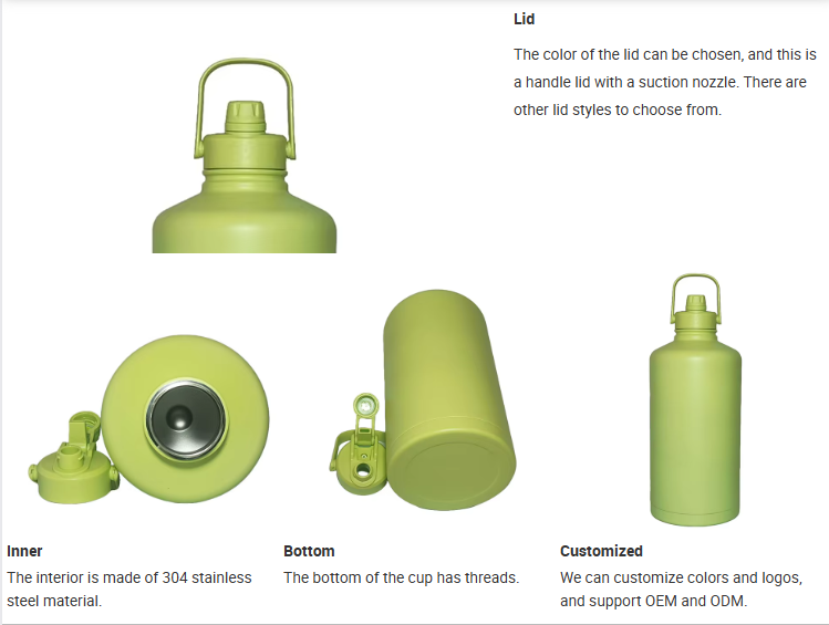 The 128OZ large mouth bottle has a flat bottom and a steel strip bottom at the bottom. There are multiple styles of lids to choose from, and the cup body can be made with various techniques according to your needs.