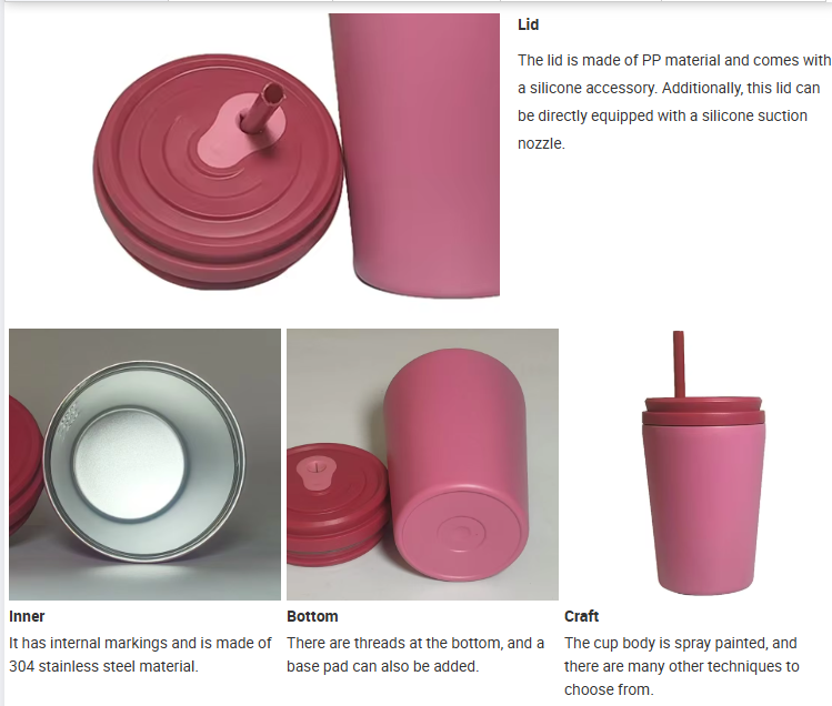 The 12OZ coffee cup is made of 304 inner and outer materials. There are currently three types of lids that can be customized with bottom pads to prevent bottom wear. The cup lid can be equipped with a suction nozzle.