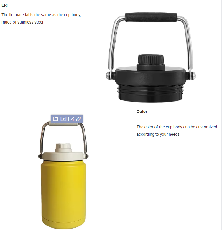 The cup has a capacity of 128OZ and adopts spray coating technology with gradient colors. The lid is a steel handle lid, and different lids can be selected for matching.