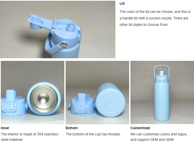 This is a newly designed cup body, a 24OZ large mouth bottle, with a suction nozzle cover designed with a handle and a threaded bottom.